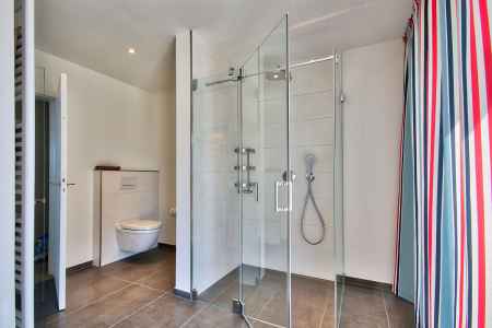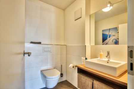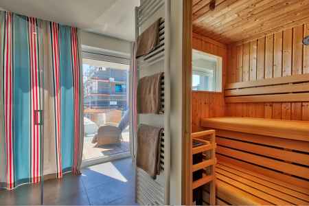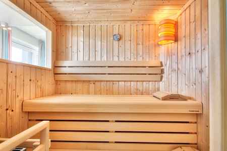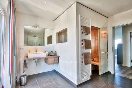 Im voll ausgestatteten Badezimmer mit Sauna kann man den Blick auf den Hafen und die Ostsee geniessen. Ein zweites kleines Bad mit Toilette rundet das sanitäre Angebot ab.