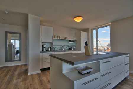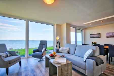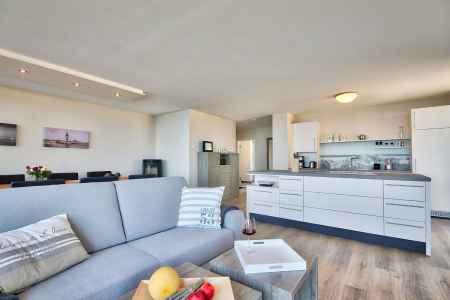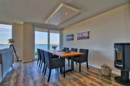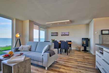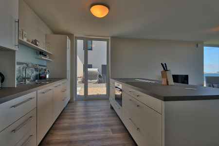 Die offene Wohnküche mit Herdinsel ist zum Wasser ausgerichtet, damit auch beim Kochen der Blick auf die Ostsee fällt. Die hochwertig ausgestattete Küche mit allen Annehmlichkeiten, die man von einer modernen Küche erwartet: namhafte Gerätehersteller, komplette Geschirr- und Küchenutensilienaustattung inklusive.